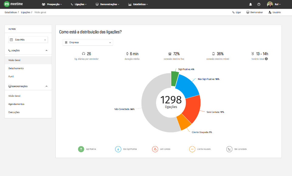 É possível saber como estão tanto a qualidade quanto a quantidade das ligações: sua empresa pode monitorar o volume de ligações diárias, as taxas de conexão e a taxa de ligações significativas, onde há avanço no processo comercial. Esse extrato é obtido vendedor a vendedor, permitindo ao gestor maior controle sobre a operação.