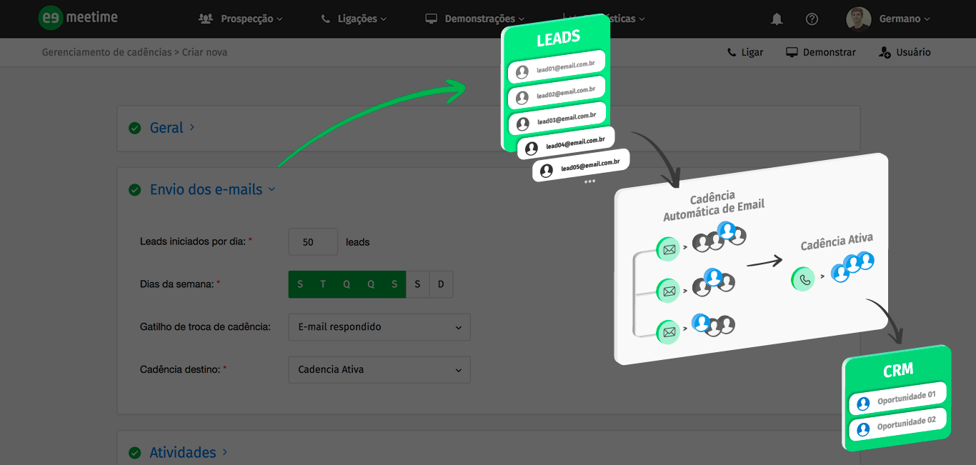 Os leads são enviados automaticamente do RD Station diretamente para as cadências de prospecção no Flow, dando mais agilidade ao trabalho na prospecção. Sua empresa pode separar os diferentes tipos de leads em várias cadências diferentes, encontrando a ideal para cada variedade de lead.