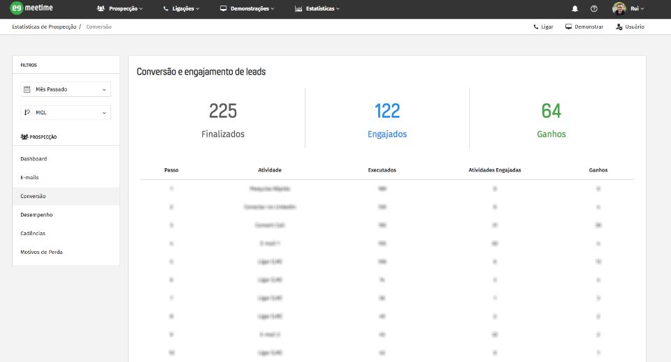 Sua empresa tem uma visão completa do que está acontecendo na prospecção: quantos leads são abordados por cada vendedor, dentro das cadências separadamente. É possível saber como estão as taxas de abertura dos e-mails, de ligações conectadas, significativas e de leads ganhos, por exemplo.